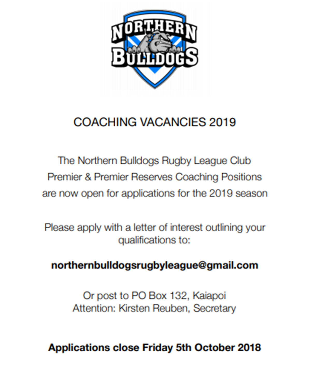 NORTHERN BULLDOGS 2019 COACHING VACANCIES