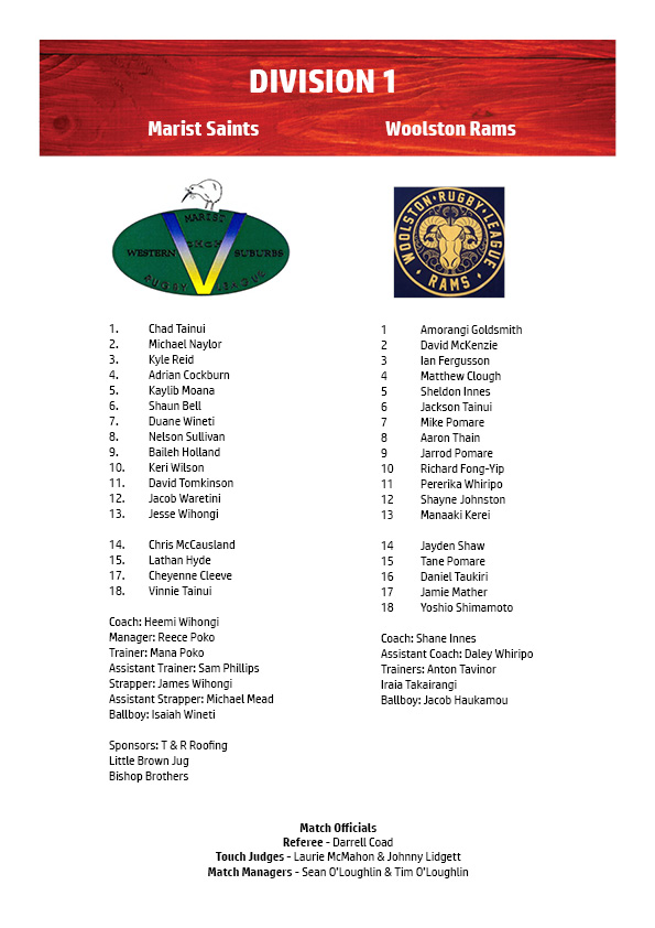 The 2017 Division One grand final combatants square off again in this year’s decider. Woolston Rams prevailed 28-20 on that occasion, but Marist Saints carry the favouritism tag after dropping just two games all season and accounting for defending champs Burnham Chevaliers 26-4 in the major semi.