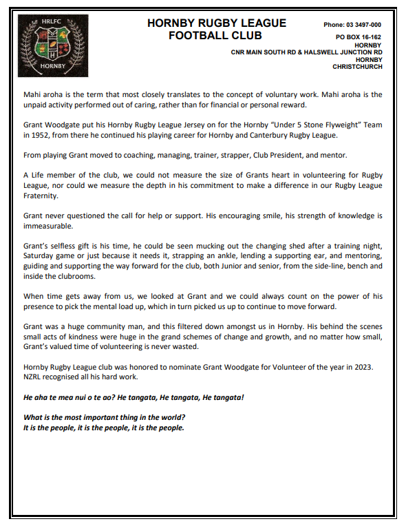 Woodgate was the epitome of the backbone every grassroots sports organisation needs to survive and thrive. Though unassuming, he was central to every success Hornby Panthers have had. That he was October 2022’s NZRL Volunteer of the Month reflected how much he dedicated to the club to the very end.